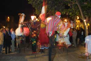 The road cuts back and forth across a railway line here. After another climb, the route reaches the Ticlio Pass, or Abra Anticona. The railway line makes another appearance at the summit - claiming to be the highest railway line (and indeed level crossing) in the world. The road is likely to be the highest asphalt main road in the world, too: certainly it's the highest in the Americas. Many crews paused here for photos as the day was more relaxed thann of late, with time controls just at the beginning and end of the day. What goes up must of course come down - and from Ticlio it's downhill all the way to Lima in some of the most impressive hairpin sequences imaginable. At the resort complex of El Pueblo - a setting reminiscent to those who remember it of the 1970s series The Prisoner - tremendous treats awaited the crews. Many had cars to look after, of course, but it was worth trying to make time to relax a while. The Automobile Club of Peru had prepared yet another brilliant welcome for the Inca Trail: in the tented exhibition area that all crews drove through as they arrived, a display of some 50 members' cars waited for our classics to join them. After a few hours' relaxation for those without car worries, it was time to party. We were promised a barbecue .. but it was accompanied by music. Then the fireworks began. And finally, stilt walkers, carnival characters and dancers created a fiesta. Soon the entire rally was dancing like there was no tomorrow. What a way to begin our 'weekend'. Long memories Bill Price, one of HERO's mobile mechanical wizards, was surprised to be turned into an instant celebrity as his Course Car pulled into the rally car park at El Pueblo. |